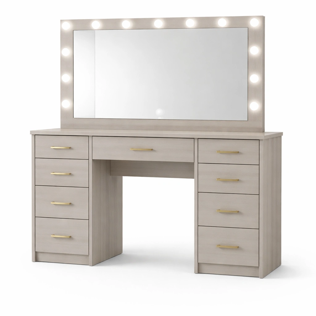 Coiffeuse en bois avec miroir LED et 9 tiroirs gris
