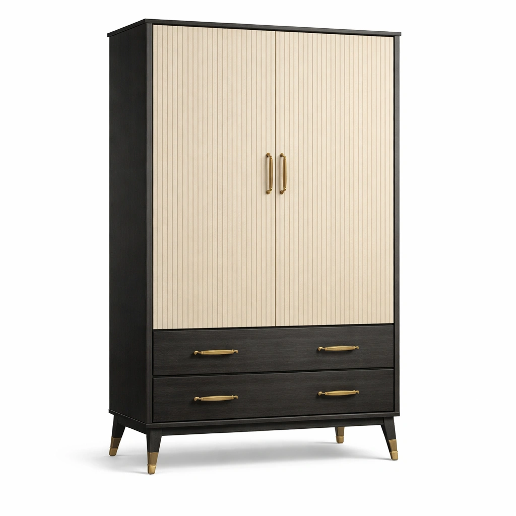 L'armoire est fabriquée en MDF avec une finition noire et peinte en beige. Elle est équipée de poignées en métal doré. Deux portes battantes et deux tiroirs avec glissières métalliques offrent un rangement pratique.