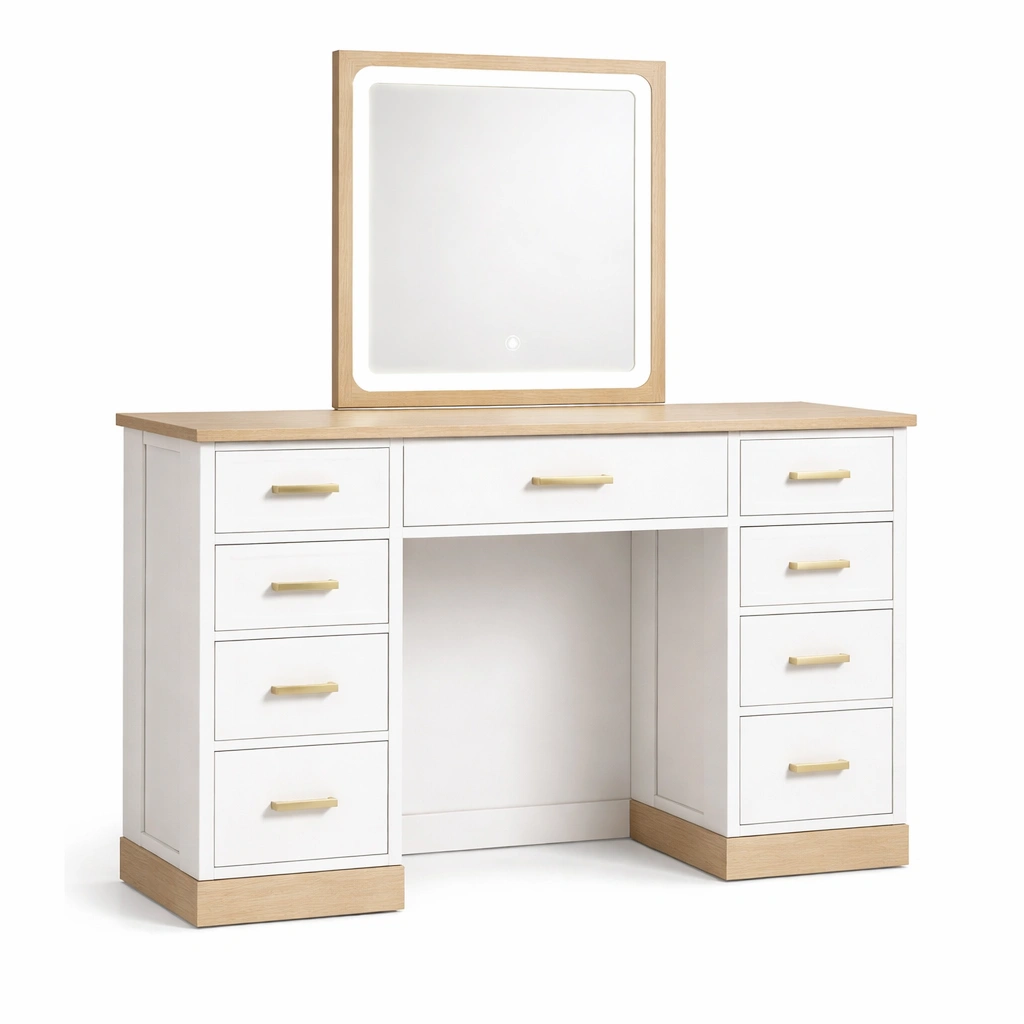 Coiffeuse blanc et chêne avec miroir LED et 10 tiroirs