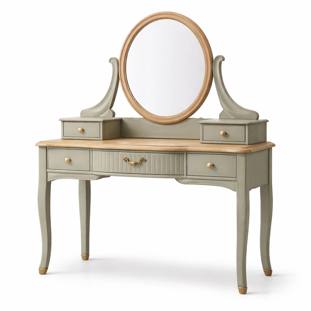 Cette coiffeuse est fabriquée en bois de pin et MDF, avec une finition peinte. Elle comprend un miroir ovale et cinq tiroirs pour le rangement. Ses dimensions sont de 110 cm de longueur, 45 cm de largeur et 135 cm de hauteur.